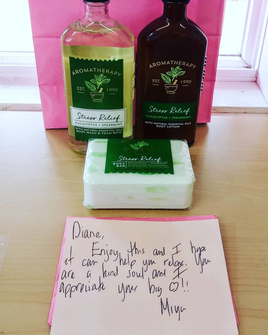 A friend of mine gave me an unexpected present this afternoon. She handed me a pink gift bag, that was heavy, and stuffed with glittery white tissue paper. Four items were in the bag: a little pink envelope containing a sweet note and gift card, a bottle of body wash/bath foam, a big bar of soap, and a bottle of lotion. All three are the same scent: Eucalyptus Spearmint. They smell amazing. She said, “That’s what I use . . . you always tell me I smell so good.” (Sidenote: she does) I couldn’t wait to get home tonight and wash the anxiety of the day away with this stress relieving scent!