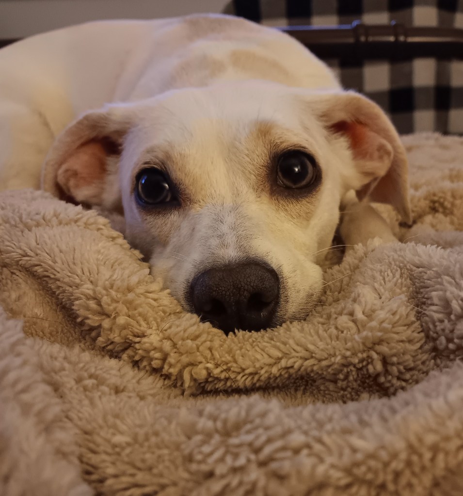 Two days after she came to my home one of her babies died. A daughter. This left me with a petite dog who was fiercely protecting the one baby she had left. I understood why she couldn’t trust me. Why she curled protectively around her one remaining baby. Life is hard to trust when your baby dies.