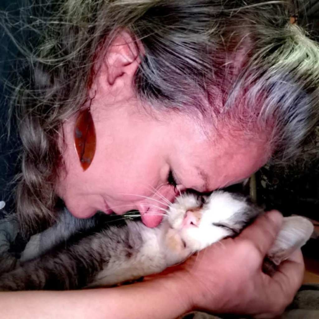 (Photo of the author with one of the cats she cared for.)